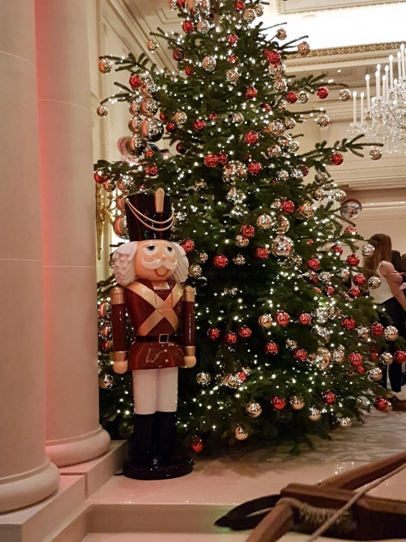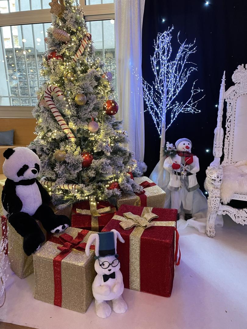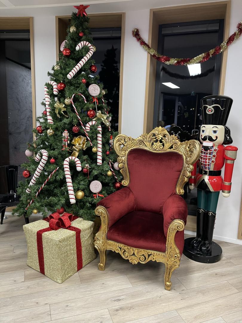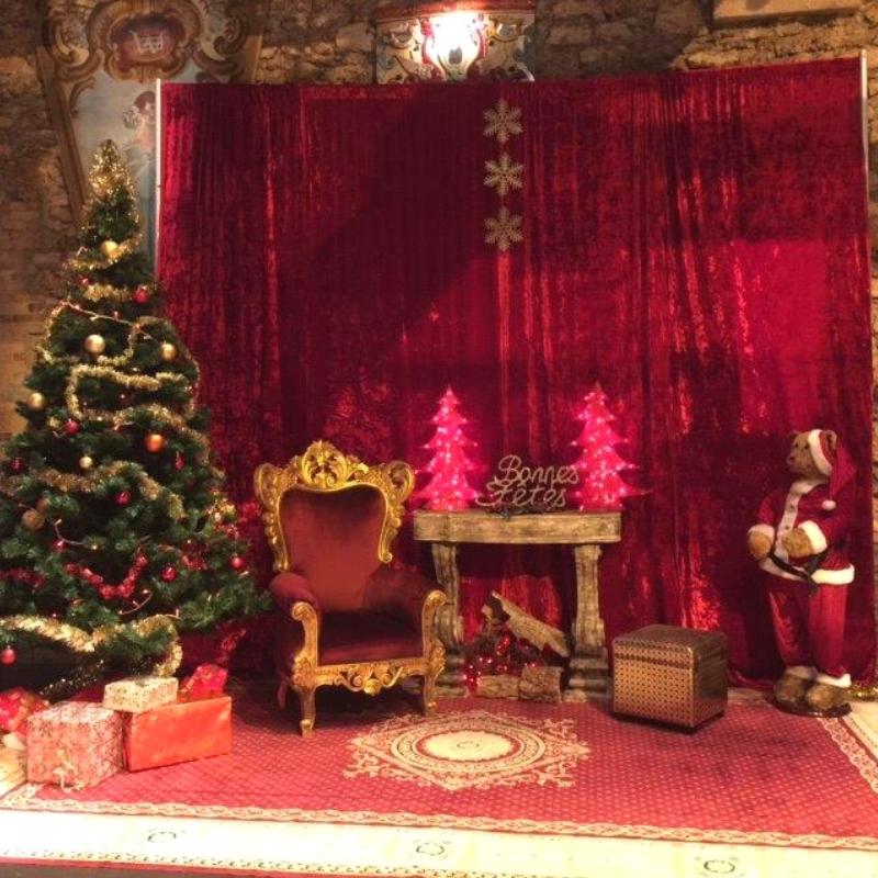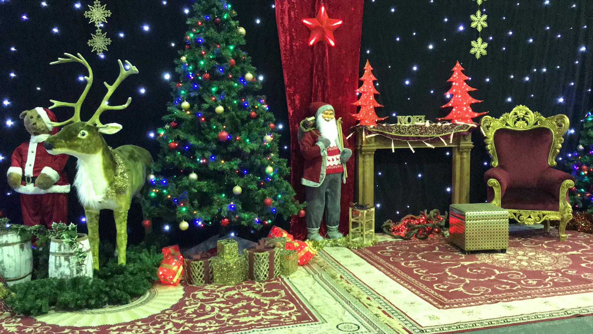 Décor de Noël chaleureux (trône rouge et doré, sapins avec guirlandes lumineuses, tapis, cheminée, barrières, peluches, Père-Noël, rennes en résine, casse-noisette, boîte aux lettres, cadeaux, effets lumières).
