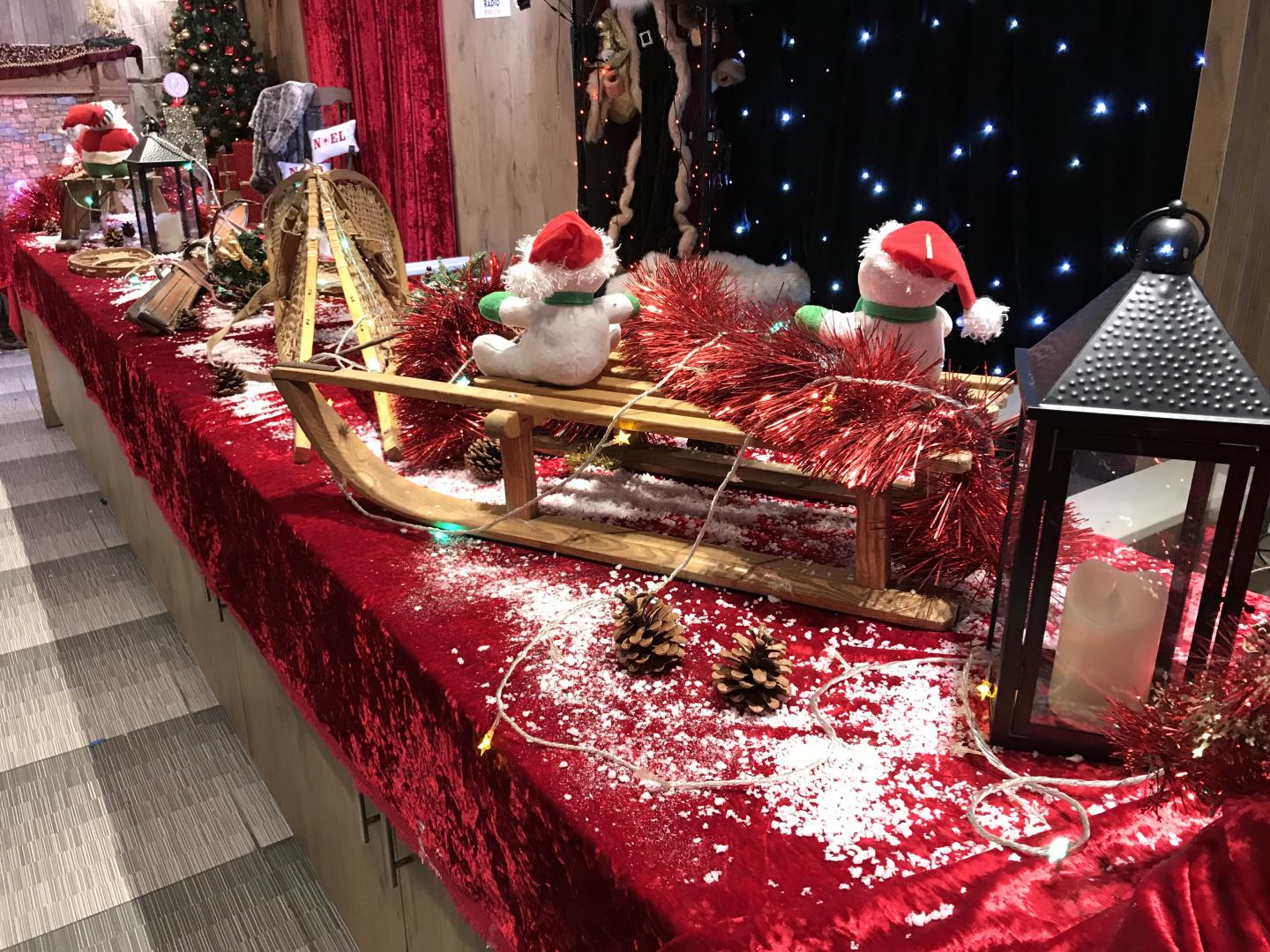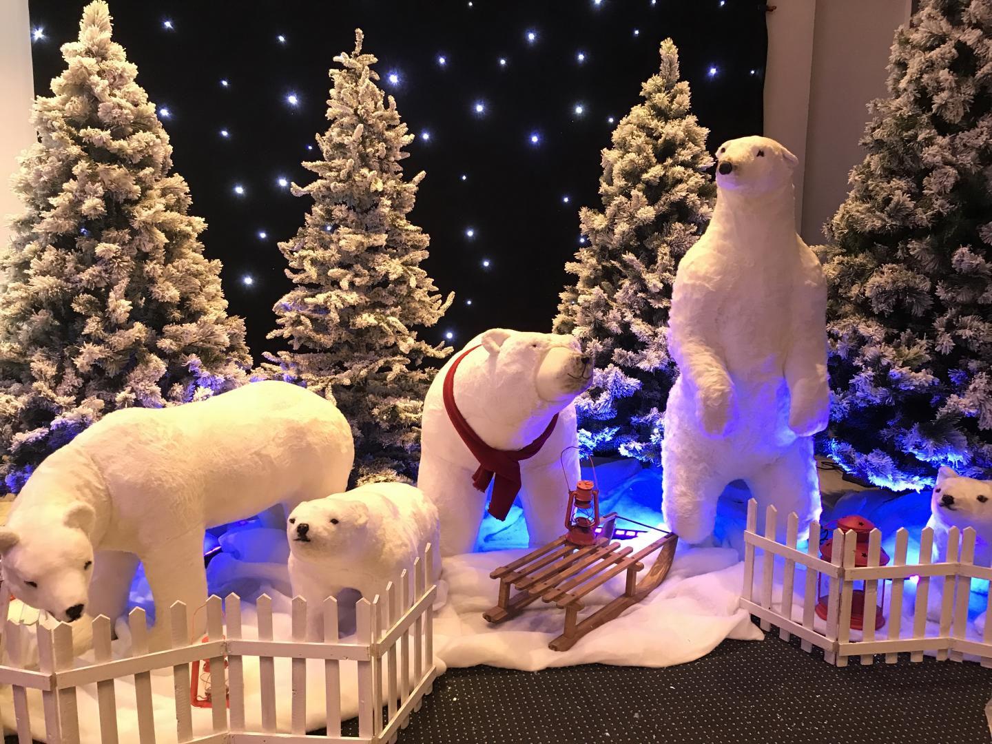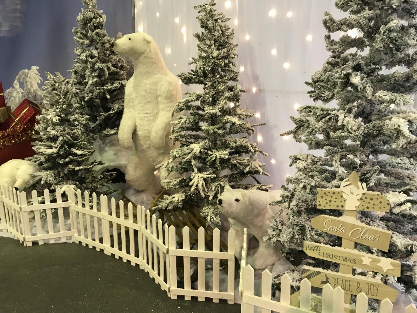 Décors de Noël polaire (trône blanc, sapins floqués, cheminée blanche, ours polaires, bonhomme de neige, panthère des neiges, pingouins, rennes blancs, traîneaux, cadeaux, fausse neige, canon à neige, barrières blanches, luge, raquettes en bois, skis en bois, effets lumières).